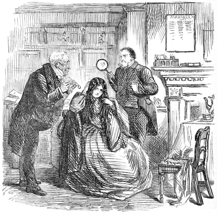 Illustration for the satirical story “Divorce a Vinculo.” Mrs. Barber shows her legal team evidence of her husband’s cruelty: a scar on her head.https://en.wikipedia.org/wiki/HM_Prison_Liverpool#/media/File:Walton_Gaol_1910.jpg
