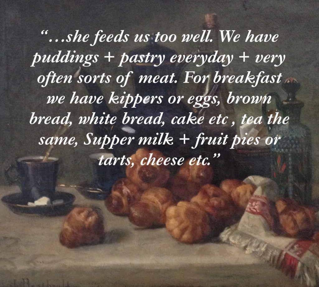 The end of Fred’s letter talks about his lodging and is a bit of an eye opening about what one might expect to eat for breakfast, “I am very comfortable here, my landlady is a widower, who belongs the house + has has some other houses belong to her so that she is not grasping. In fact she feeds us too well. We have puddings + pastry everyday + very often sorts of meat. For breakfast we have kippers or eggs, brown bread, white bread, cake etc , tea the same, Supper milk + fruit pies or tarts, cheese etc.